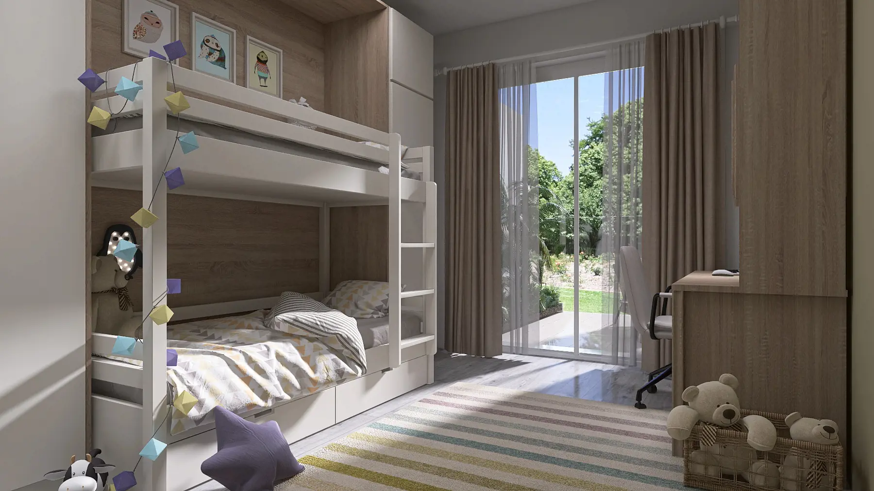 L’appartamento proposto è un grazioso trilocale arioso e soleggiato: grande e regolare è il soggiorno, con la cucina a vista che rimane seminascosta, e si apre sulla loggia, esposta a sud, sufficientemente spaziosa per ospitare una grande tavolata che affaccia sul giardino privato; a servizio della zona living c’è un pregevole bagno, con ripostiglio, anch’esso affacciato a sud; il disimpegno ed il secondo bagno dividono la zona notte, più intima e riservata, composta da 2 spaziose camere doppie che proseguono sull’ampia terrazza coperta che guarda il giardino a nord.