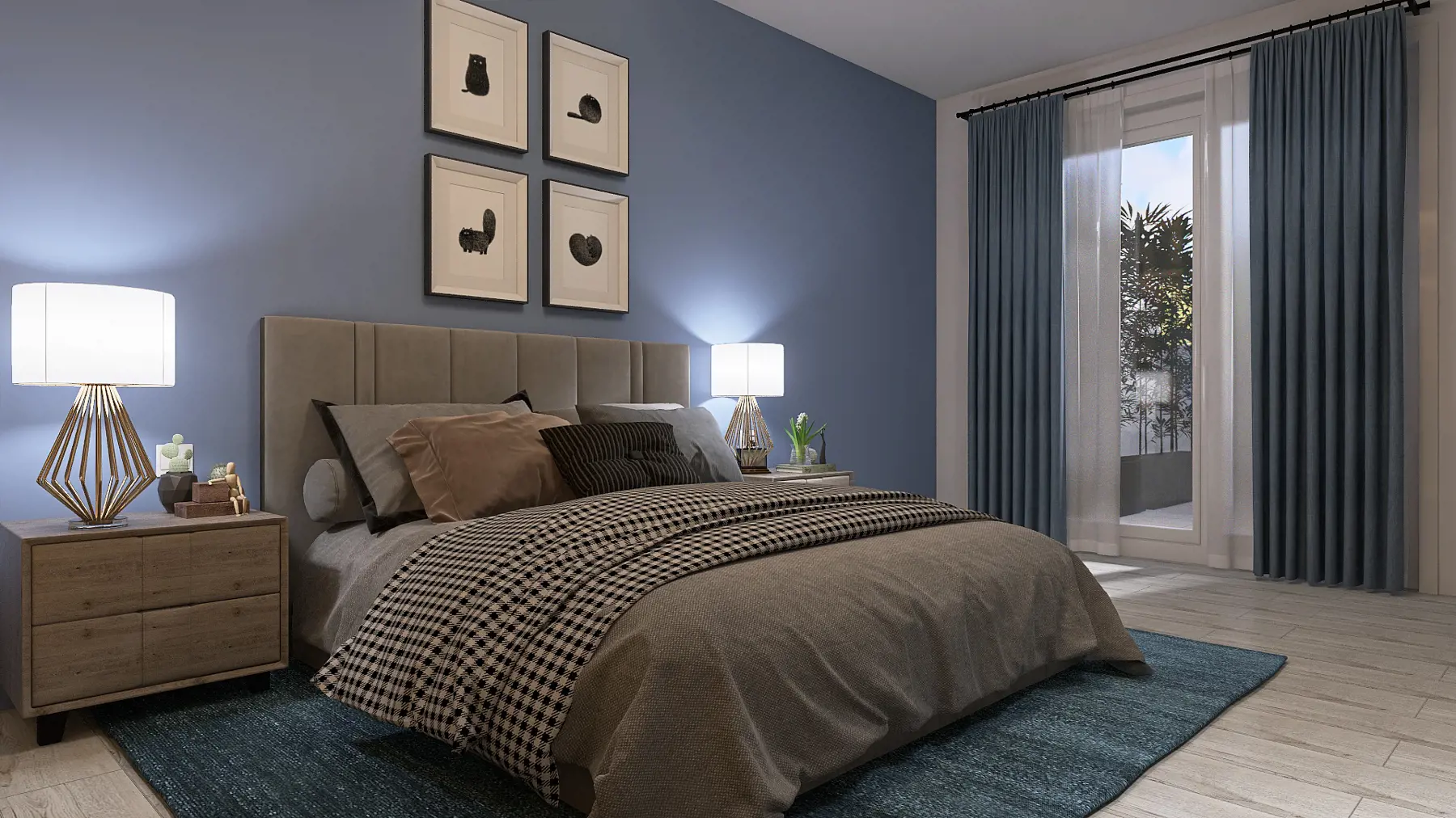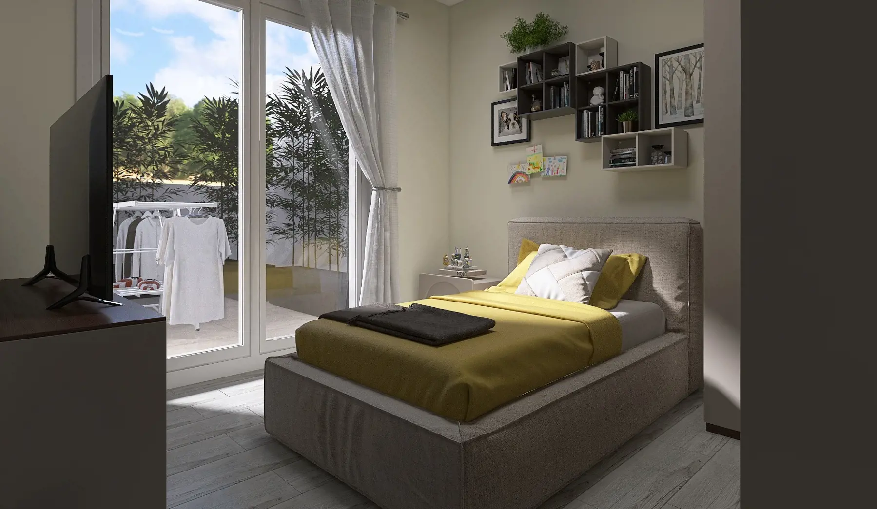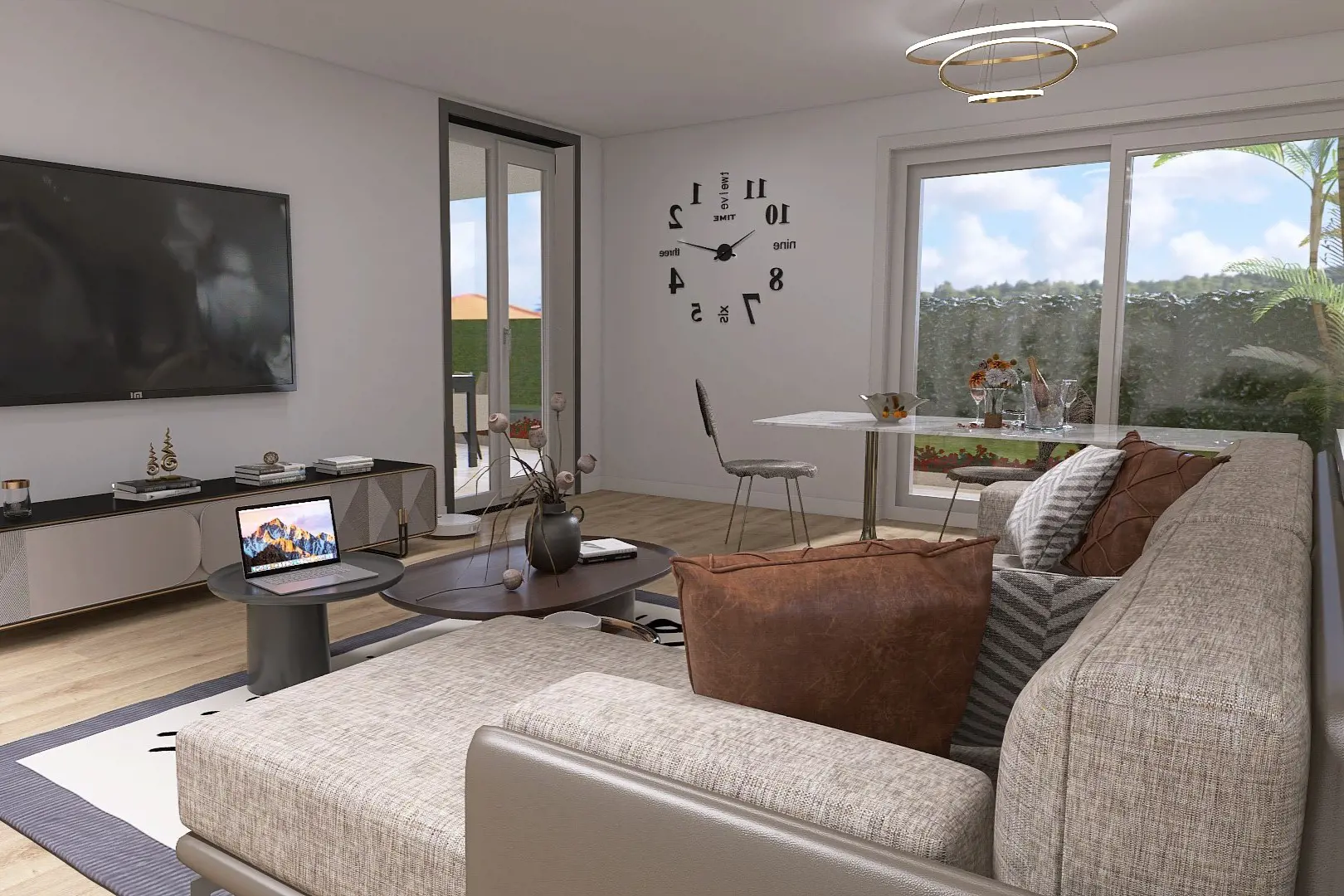 La soluzione proposta è un comodo trilocale dagli ambienti luminosi e razionali: l’ingresso è separato e nasconde alla vista il soggiorno che, con la cucina a vista, si apre all’esterno mediante le grandi vetrate che permettono alla preziosa loggia di essere parte integrante degli ambienti interni; c’è un comodo bagno con ripostiglio a servizio della zona living e, senza perdere inutilmente spazio, la zona notte col bagno grande e le 2 comode camere, entrambe affacciate sulla terrazza.